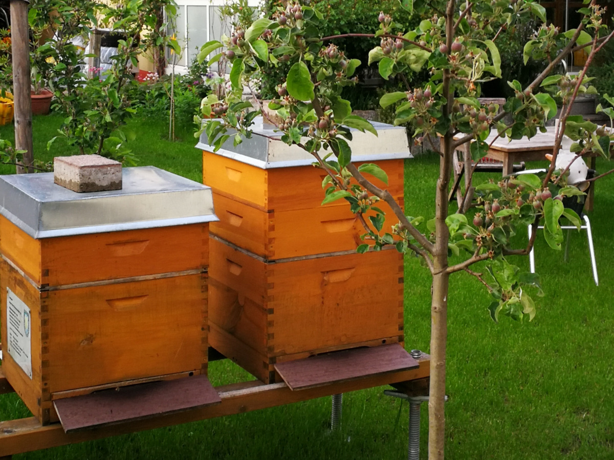 Meine Bienen, Carnica und Buckfast, leben mit uns auf unserem Grundstück in der Stadt und sorgen mit ihren Ausflügen für hohe Bestäubungsleistung und wohlschmeckendes, heimisches Obst, blühende Blumen und üppige Pflanzen .